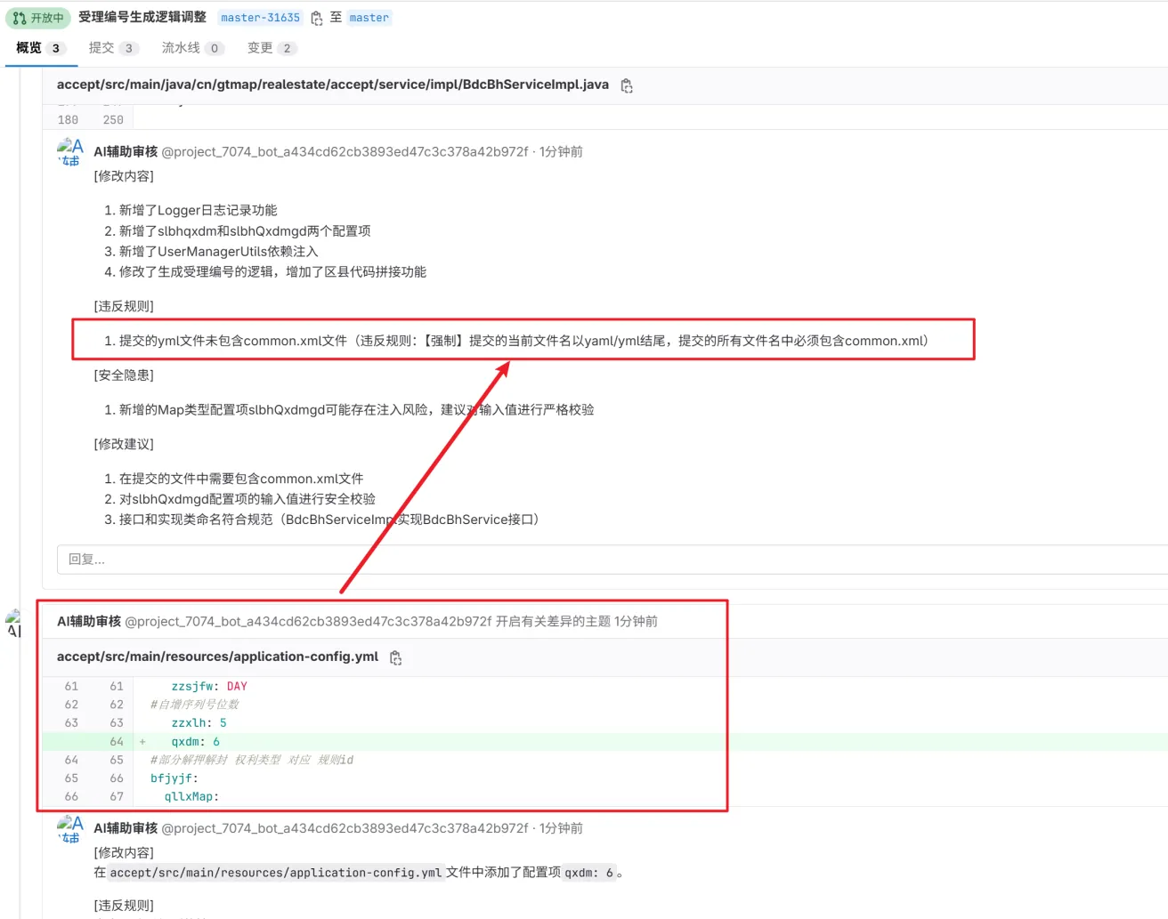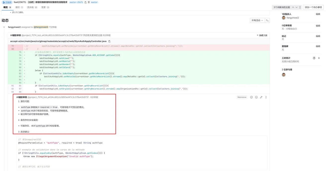 CR-Copilot是一个基于开源大模型的代码评审助手,它能够自动对GitLab合并请求(MR)中的代码变更进行智能评审。当您在GitLab上创建一个新的合并请求时,CR-Copilot会自动分析代码变更,并在MR的timeline或file changes中提供专业的代码评审意见。